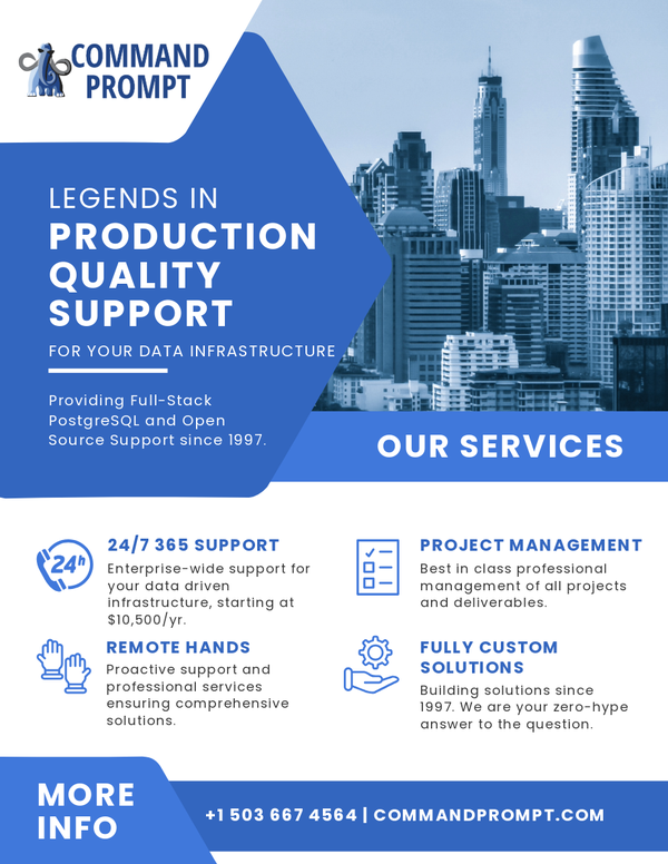 Command Prompt, Inc., is the oldest Postgres Company in North America and one of the oldest Open Source firms still operating today. We serve our clients with best in class expertise and professionalism. You can read more about support and services here: